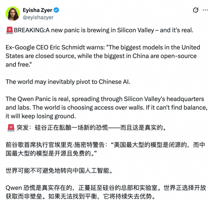 一个则是目前已经在硅谷蔓延的一种情绪。海外社交媒体已有人总结为一个流行词“千问恐慌”(QwenPanic)。大意:以阿里巴巴千问大模型代表的开源模型,在成本上有优势,在开源上会获得更大客户,而反观美国,闭源路线可能走窄,以及大力发展AI的负债隐忧浮现。这种情绪,与年初deepseek引发的情绪是一脉相承的。它的立论基础,是以千问为代表的开源大模型正在吃下越来越大的市场。